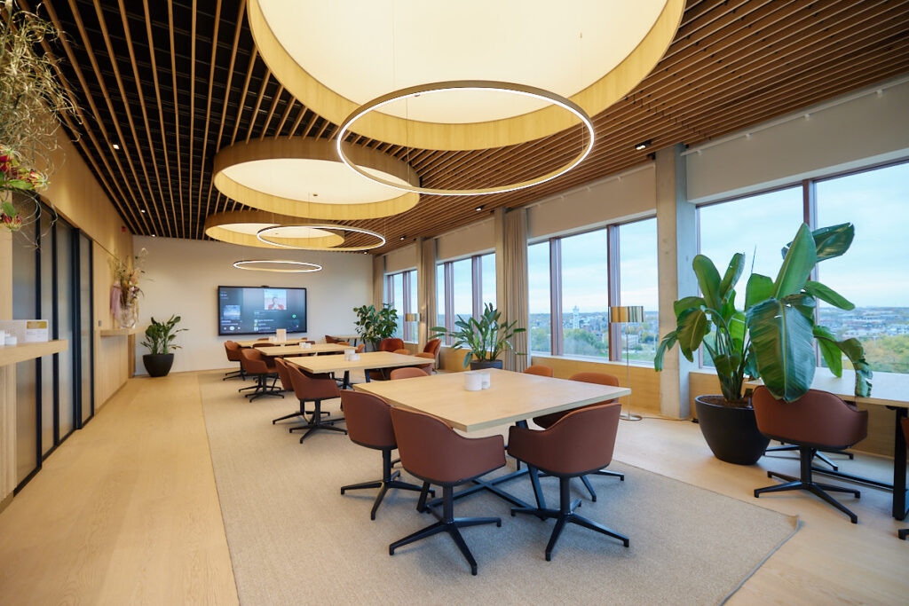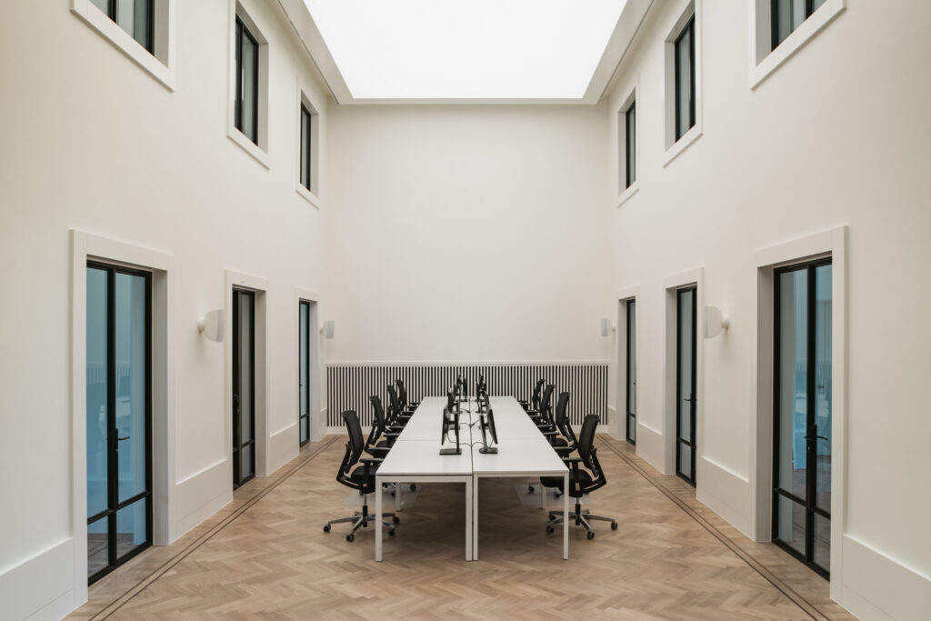 Lichtdoorlatende spanplafonds die de ruimte vullen met zacht, diffuus licht.