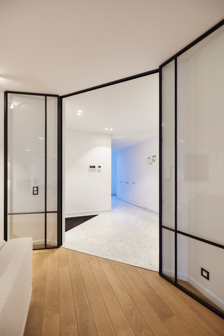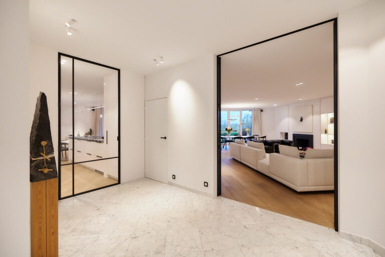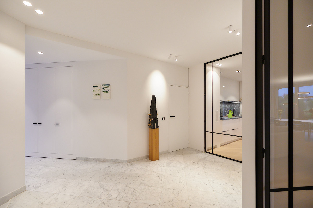 Upgrading from a villa to an apartment sounds like a trade-off, but for this client, it was pure gain. After years in a spacious villa, he and his wife consciously opted for a more compact home: closer to friends, within walking distance of the Leie River. At Residence Christophe in Latem, they found a modern ground floor full of light and glass – visually perfect – but he knew the pitfall: friends complained about noise and reverberation.