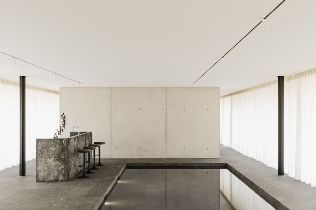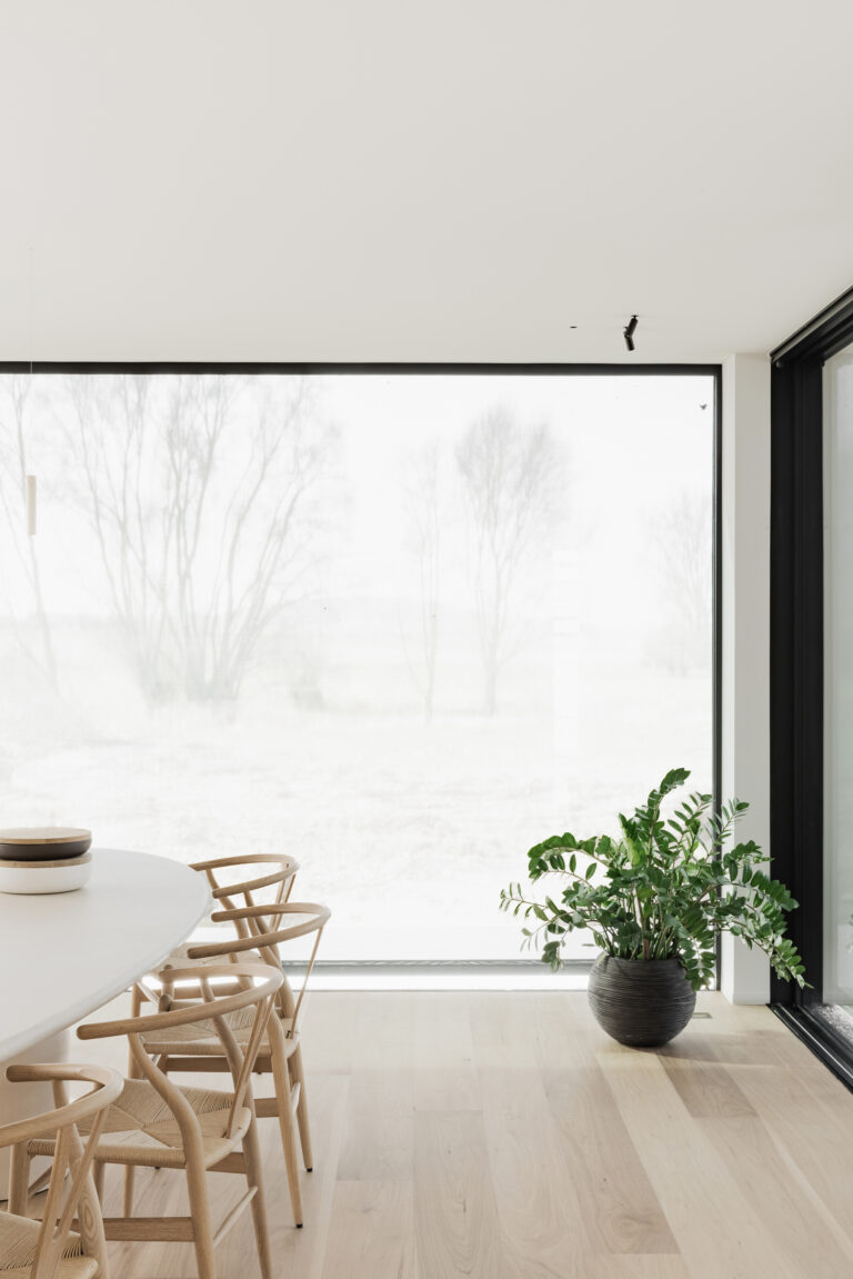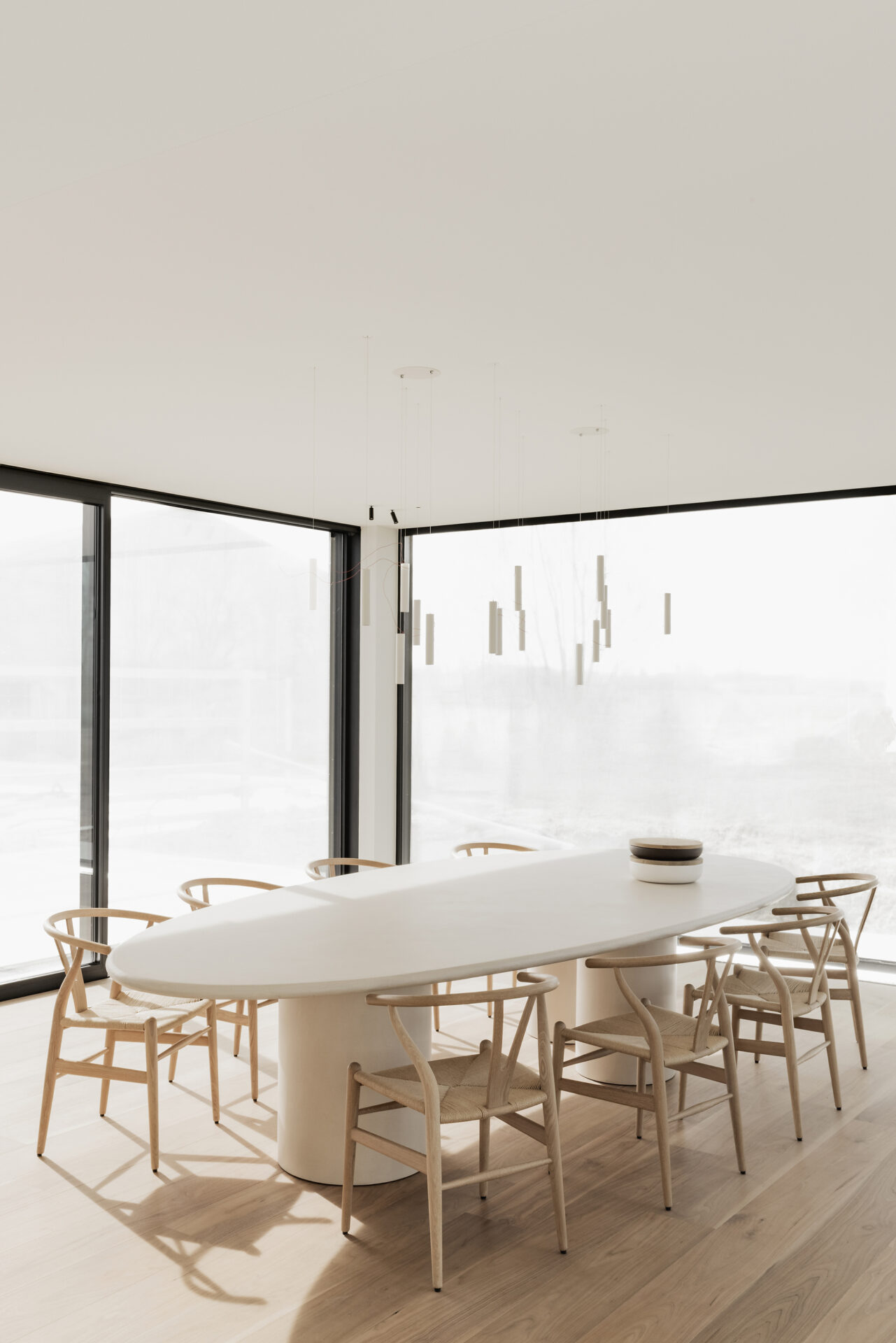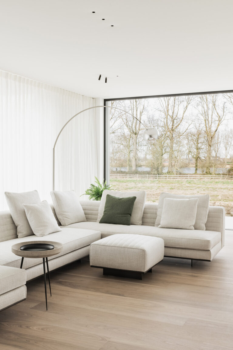 In deze residentie in de Westhoek ontmoet je een interieur dat de natuur niet simpelweg omlijst, maar er actief mee in dialoog gaat. De royale glaspartijen trekken het landschap naar binnen. Licht schuift langs zachte texturen, kleuren mengen met de seizoenen, en de grens tussen binnen en buiten vervaagt zonder moeite.