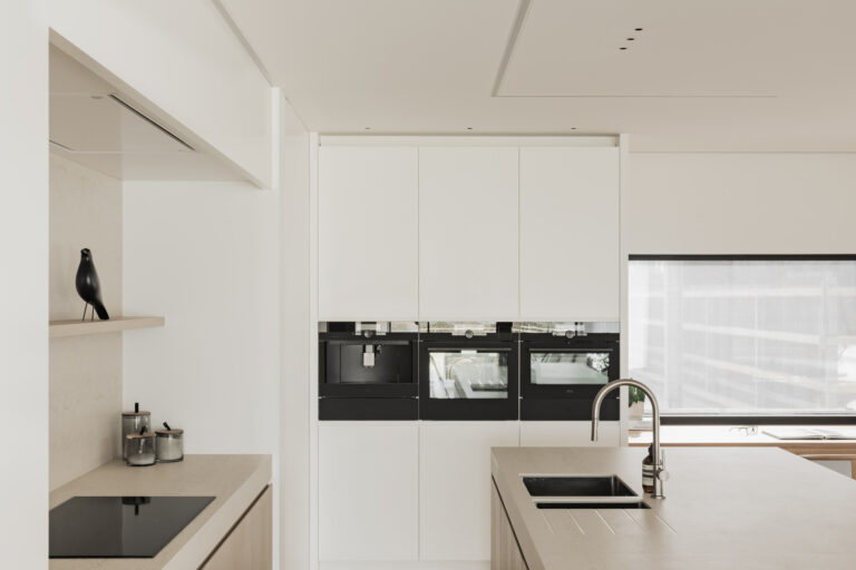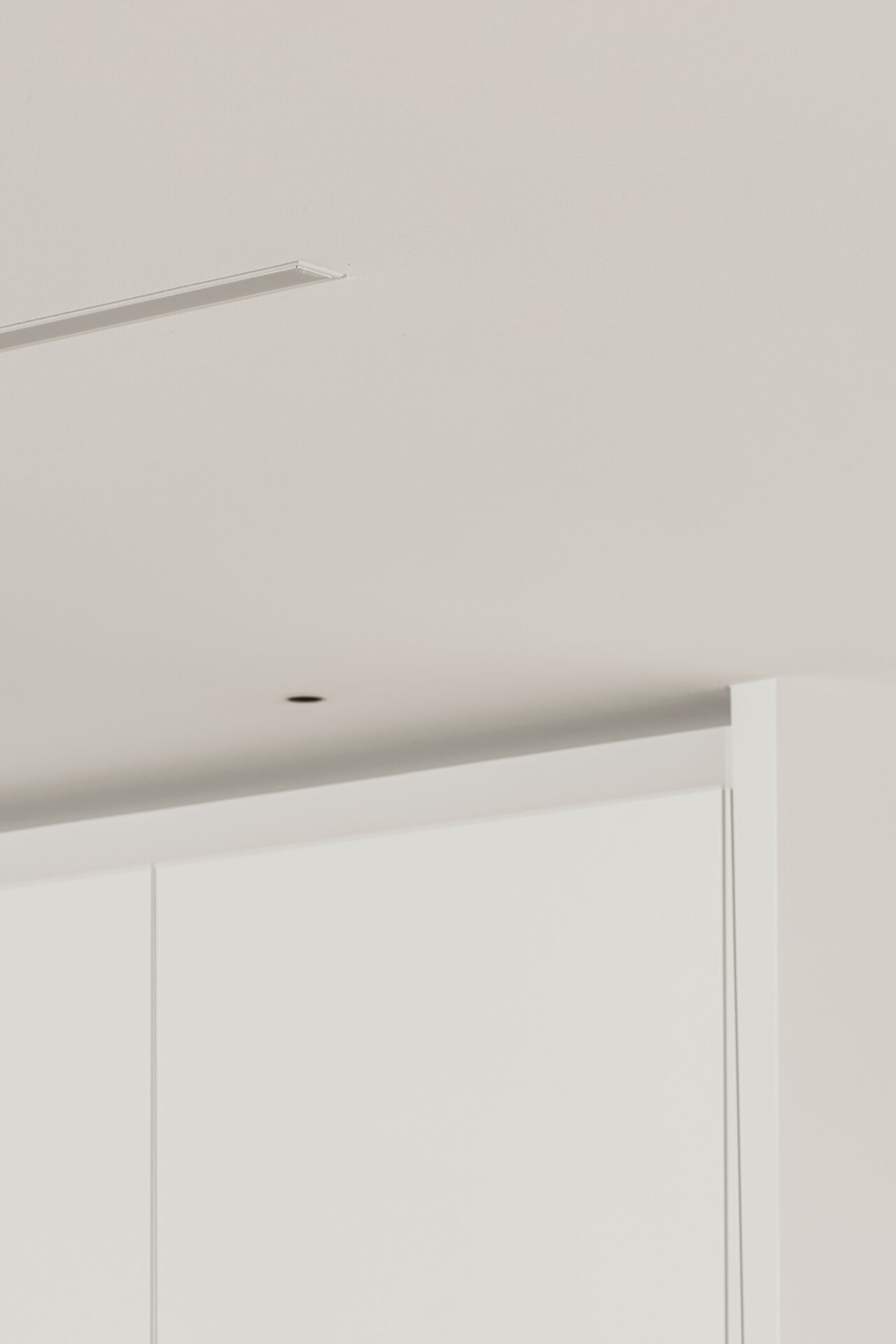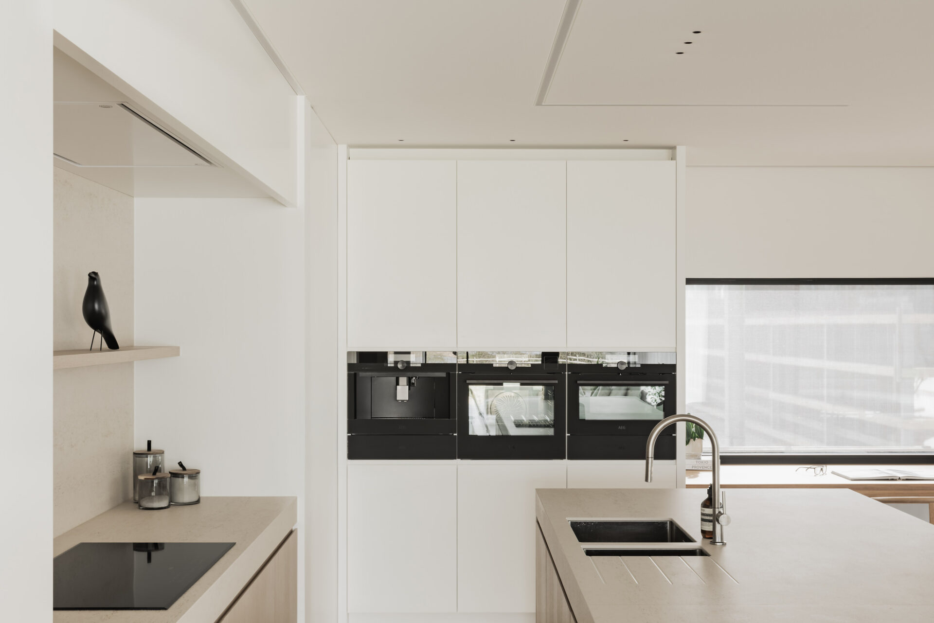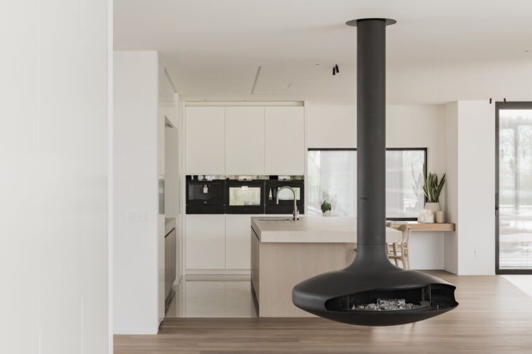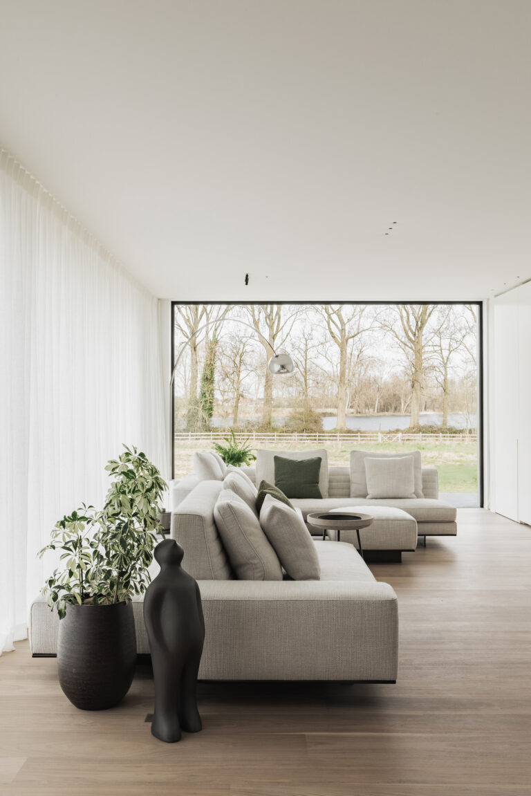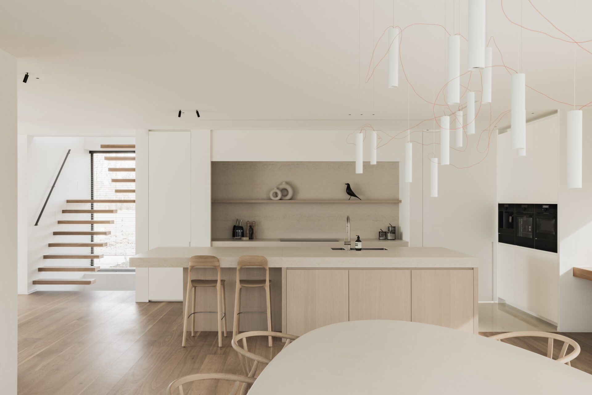 Architecturale ankerpunten zoals een zwevende trap en een sculpturale kachel tekenen duidelijke lijnen tegen de witte muur, terwijl het spanplafond zuiver doorloopt zonder zichtbare techniek. Akoestiek als ontwerpniveau tilt de ruimte naar een hoger comfort: geen zichtbare absorbers, alleen een heldere, serene geluidsbeleving. Het resultaat is een interieur dat leeft op het ritme van gezin en landschap – een plek waar gesprekken vloeien, stilte zacht klinkt en materialen samen geborgenheid creëren.