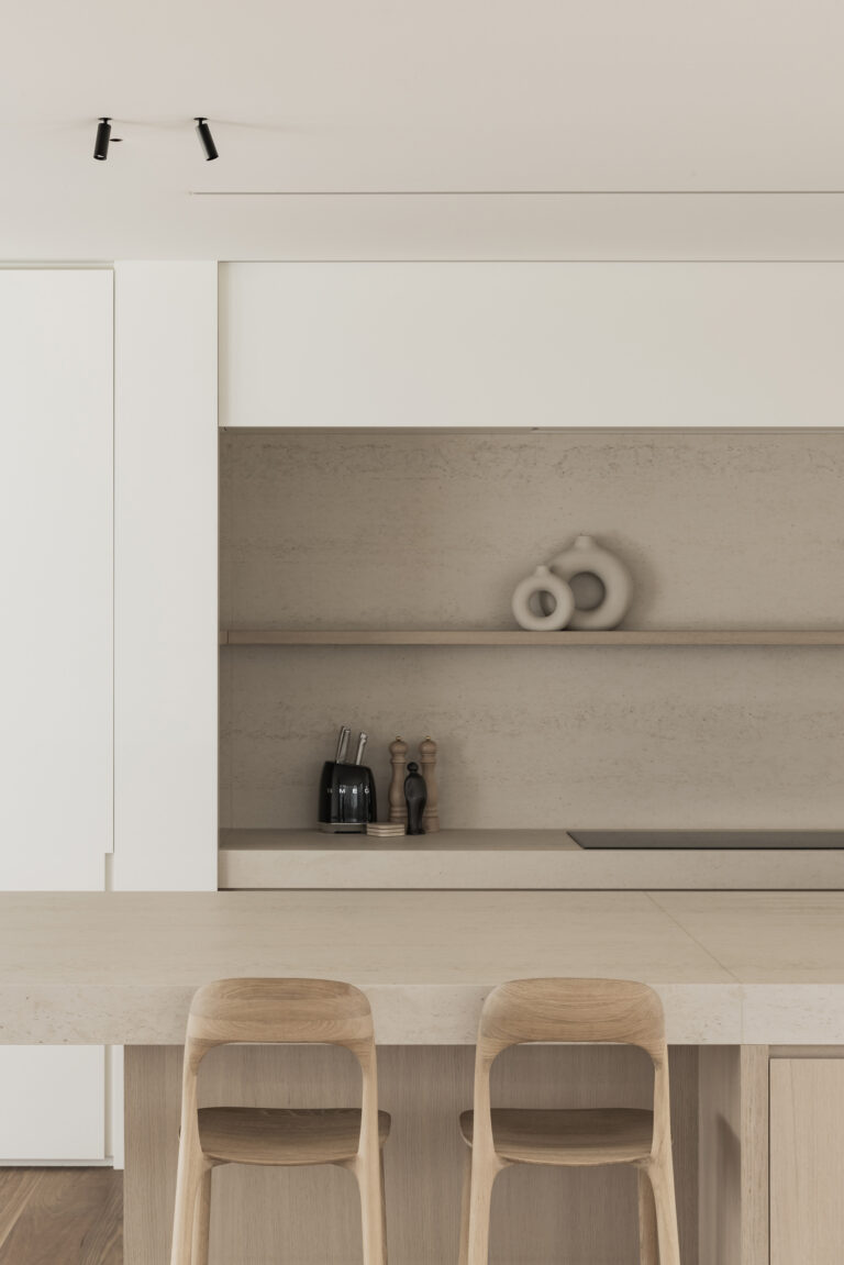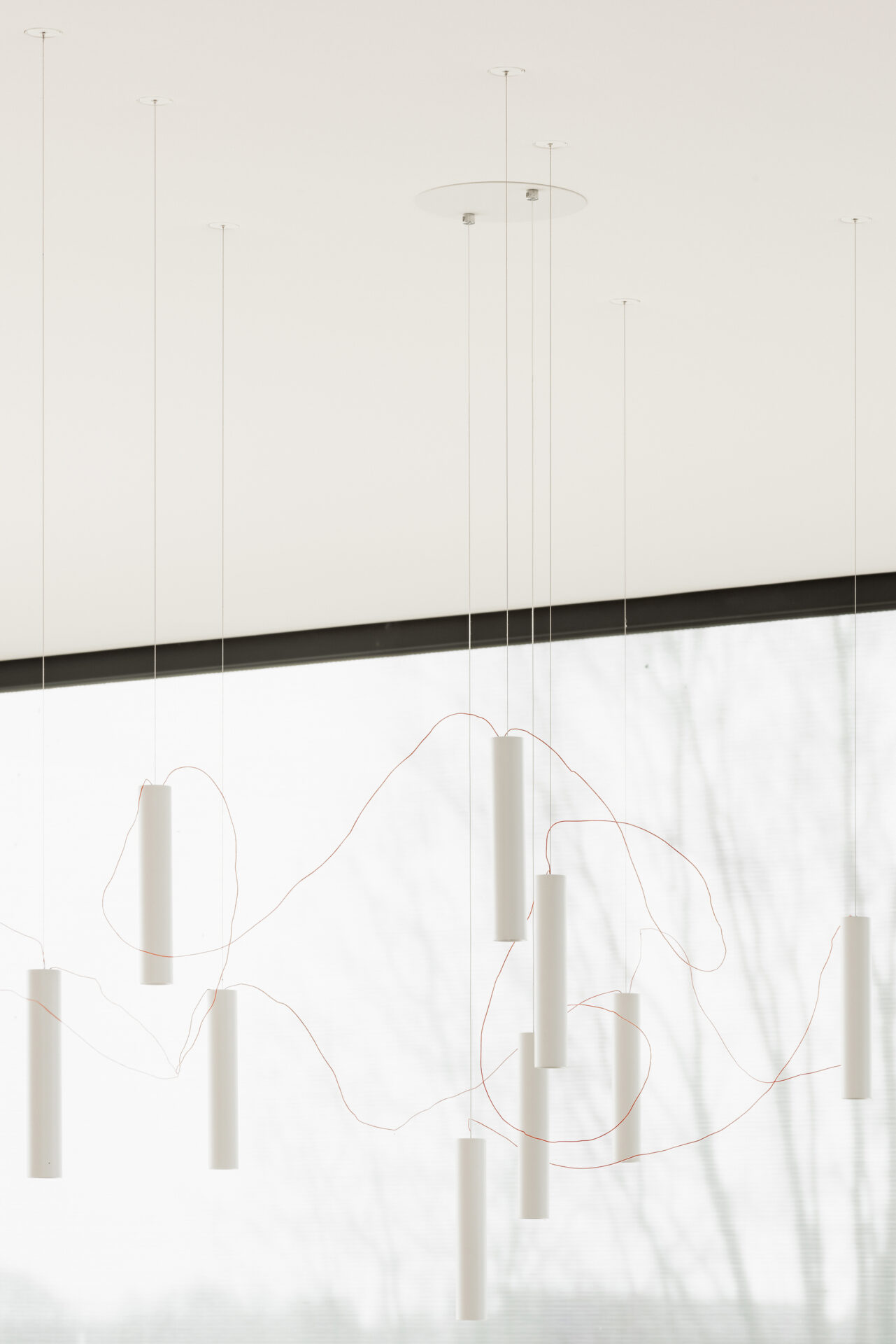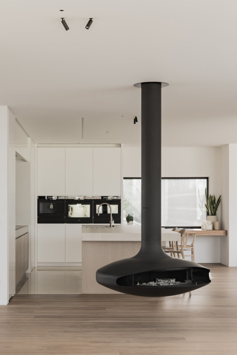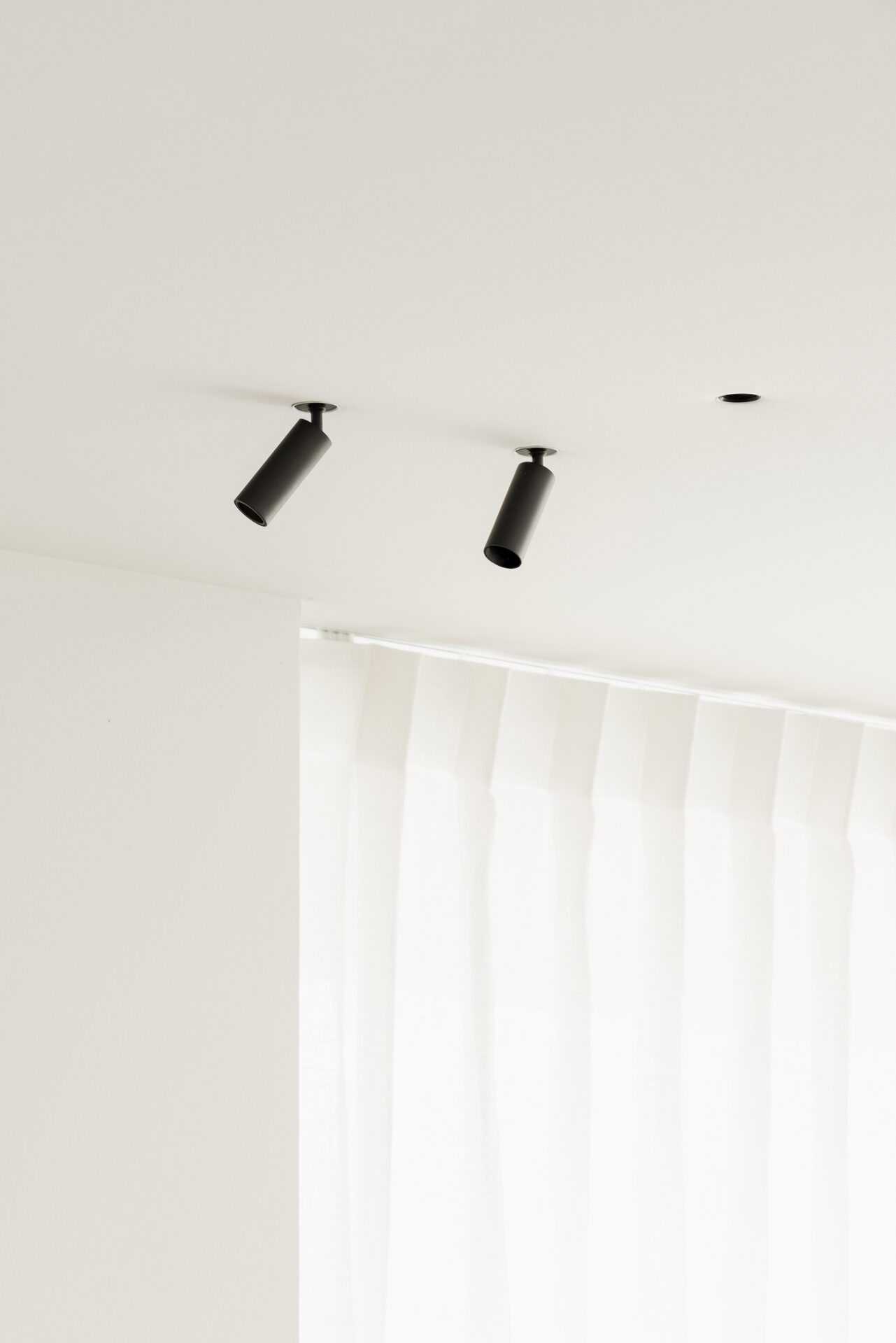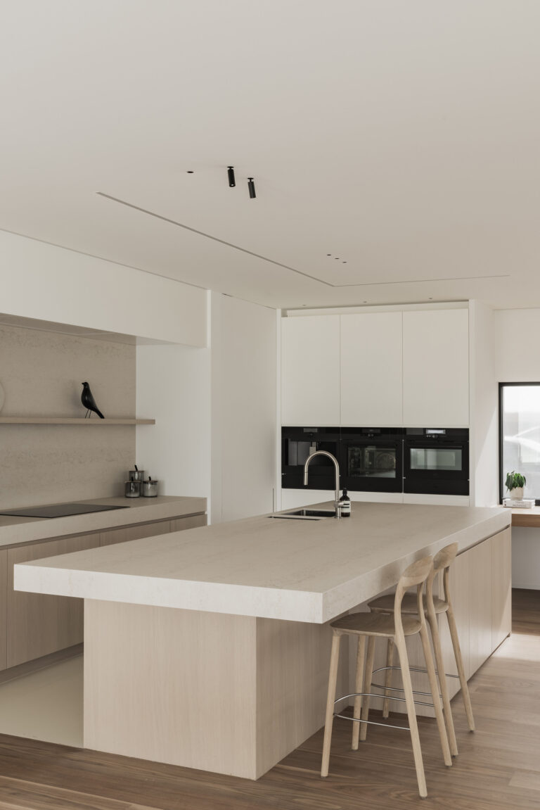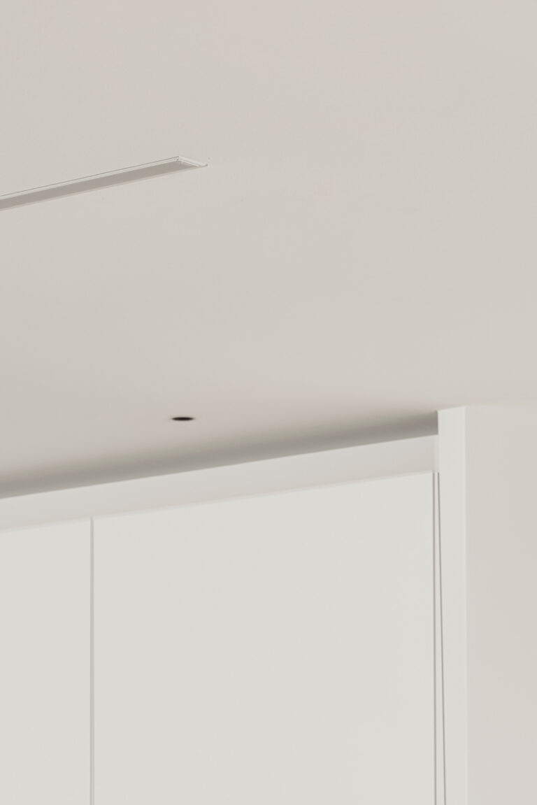 Architecturale ankerpunten zoals een zwevende trap en een sculpturale kachel tekenen duidelijke lijnen tegen de witte muur, terwijl het spanplafond zuiver doorloopt zonder zichtbare techniek. Akoestiek als ontwerpniveau tilt de ruimte naar een hoger comfort: geen zichtbare absorbers, alleen een heldere, serene geluidsbeleving. Het resultaat is een interieur dat leeft op het ritme van gezin en landschap – een plek waar gesprekken vloeien, stilte zacht klinkt en materialen samen geborgenheid creëren.